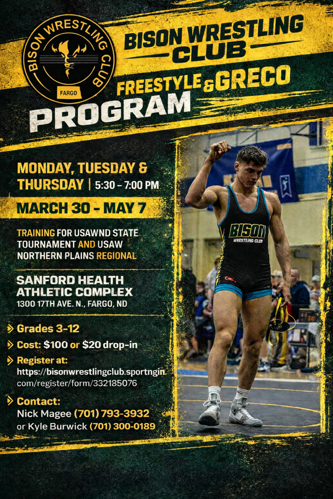 The 2026 Freestyle & Greco Program starts soon. This program is designed to prepare athletes for competition in the USAW ND State Tournament and USAW Northern Plains Regional Tournament. Details on the program can be found below: